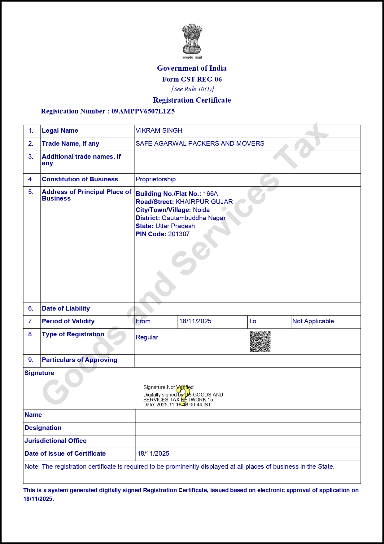 I hereby declare that Safe Agarwal Packers And Movers (GST: 09AMPPV6507L1Z5) is an independent relocation business. We are NOT affiliated with any other brand, company or entity operating under similar names. All services are provided under our own registered trade name (Safe Agarwal Packers And Movers).